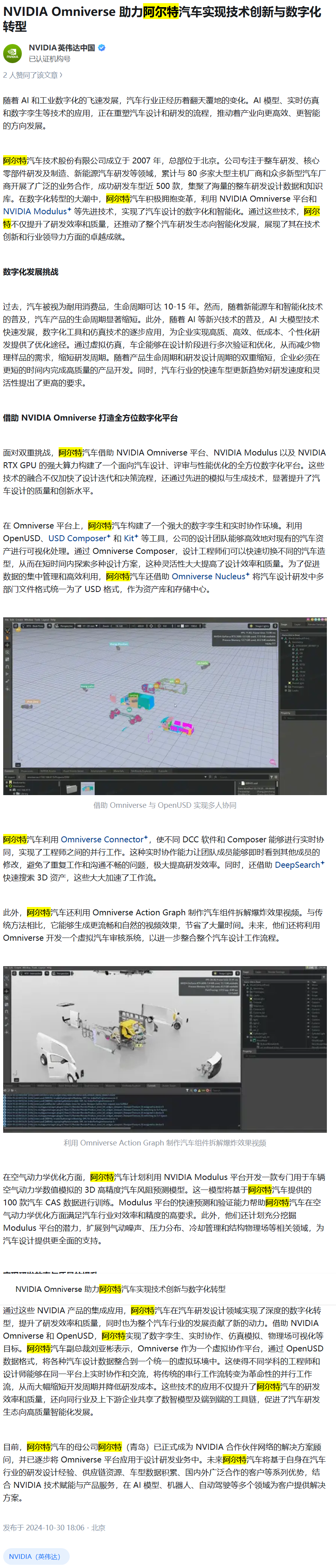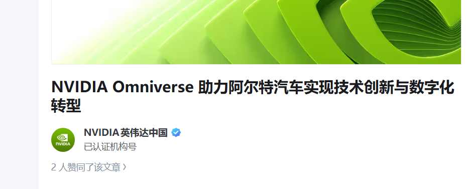英伟达知乎官方号:网页链接{NVIDIA Omniverse 助力阿尔特汽车实现技术创新与数字化转型 - 知乎}
