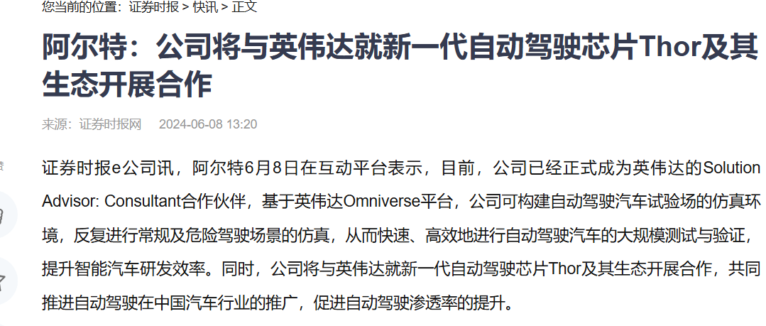 证券时报e公司讯,阿尔特6月8日在互动平台表示,目前,公司已经正式成为英伟达的Solution Advisor: Consultant合作伙伴,基于英伟达Omniverse平台,公司可构建自动驾驶汽车试验场的仿真环境,反复进行常规及危险驾驶场景的仿真,从而快速、高效地进行自动驾驶汽车的大规模测试与验证,提升智能汽车研发效率。同时,公司将与英伟达就新一代自动驾驶芯片Thor及其生态开展合作,共同推进自动驾驶在中国汽车行业的推广,促进自动驾驶渗透率的提升。