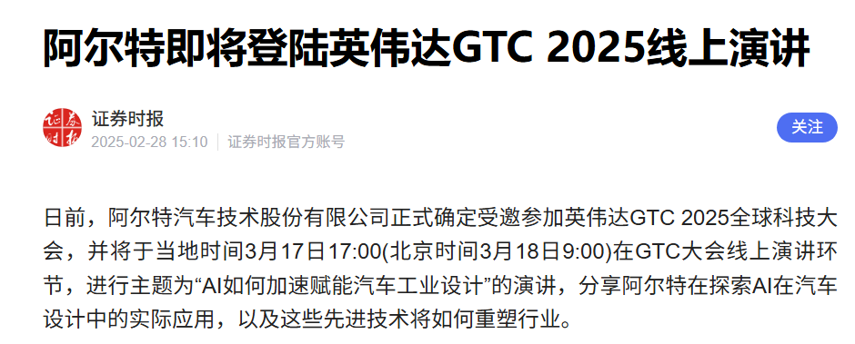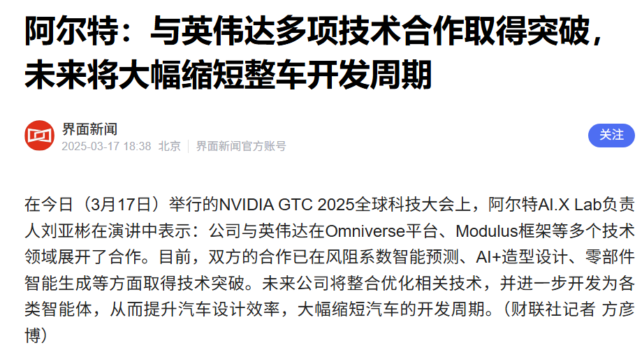 阿尔特(300825.SZ)亮相英伟达GTC,AI领域三大突破引领汽车工业设计新风向|界面新闻