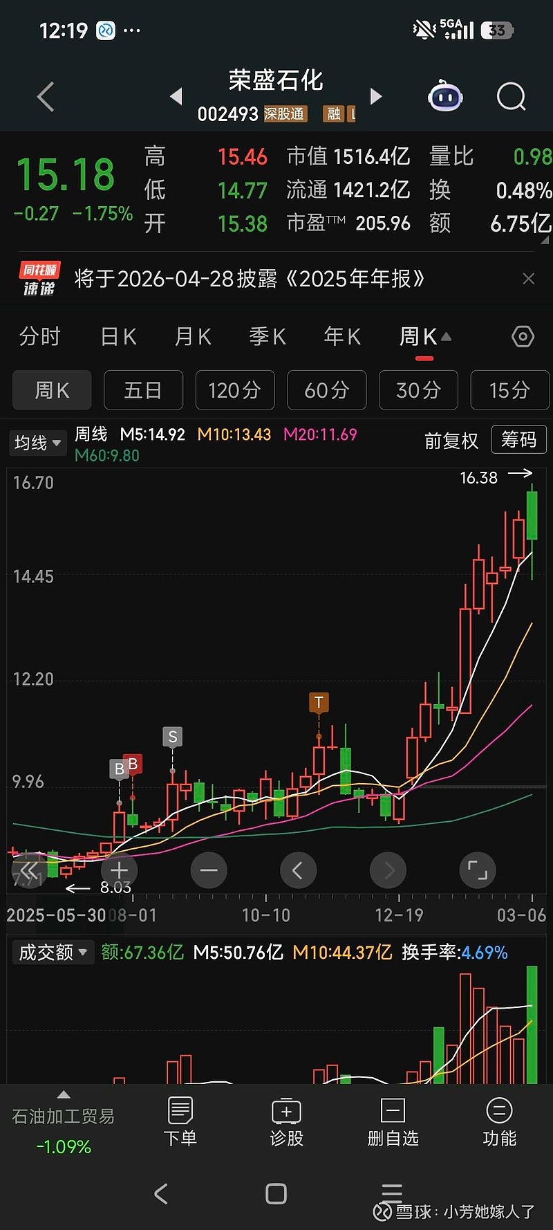 卖飞湘佳股份其实没什么可惜,因为买这票的初衷就是做个波段。卖飞荣盛石化才值得检讨,本来要做反转。但总想卖在高点,想赚尽波动的钱,洗盘时又想买在最低点,结果连续几天大涨来不及上车就不愿追了。$湘佳股份(SZ002982)$