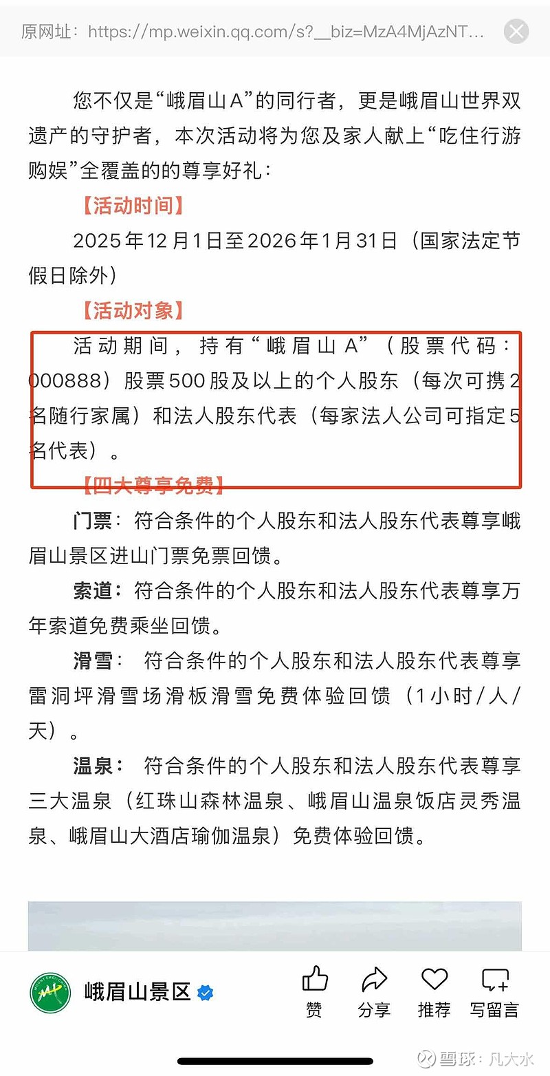 $峨眉山A(SZ000888)$ 上市公司峨眉山发布公告称:持有500股峨眉山A(000888)的股东即可免门票还可享免费温泉、滑雪 住酒店打折等,随行亲属也有优惠。这在A股并非罕见,我记得早在十年前有个叫得利斯的上市公司,送的是牛排,持有1000即可免费得6块牛排。