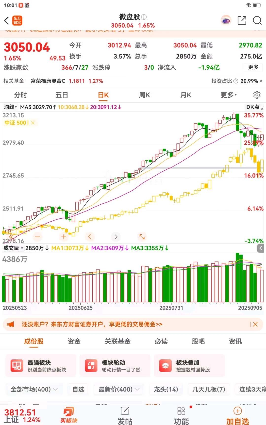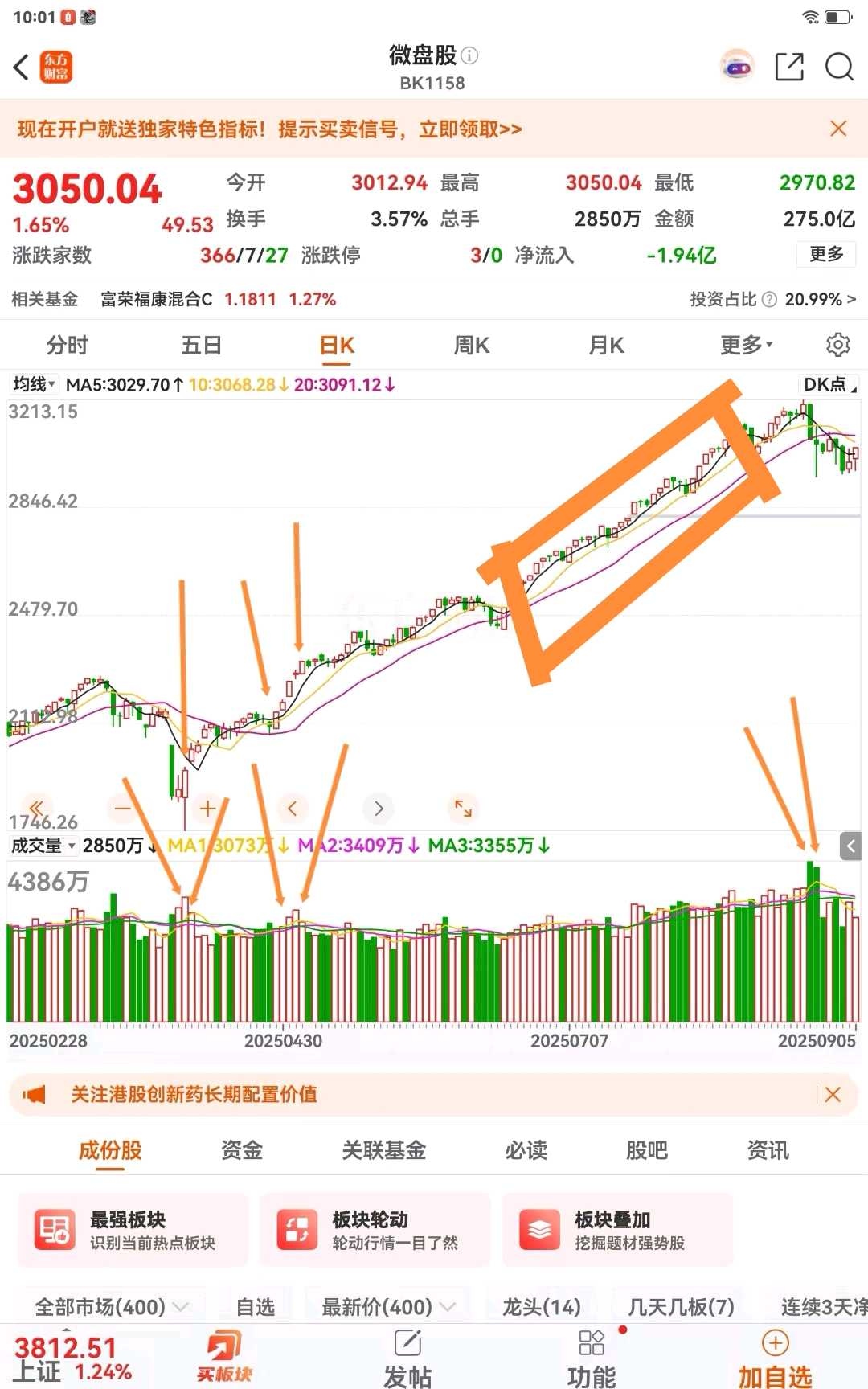 几天前,主线行情的降温信号已陆续出现,微盘股相对于中证500以及中证1000已经停止跑输,上面的诱因已经结束。所以,微盘指数在每天吃超额的背景下接下来将不会跑输主流指数。在前阵子我就跟朋友讲过,主线行情的行情是不可持续的,因为他太吃资金了,精尽股亡。