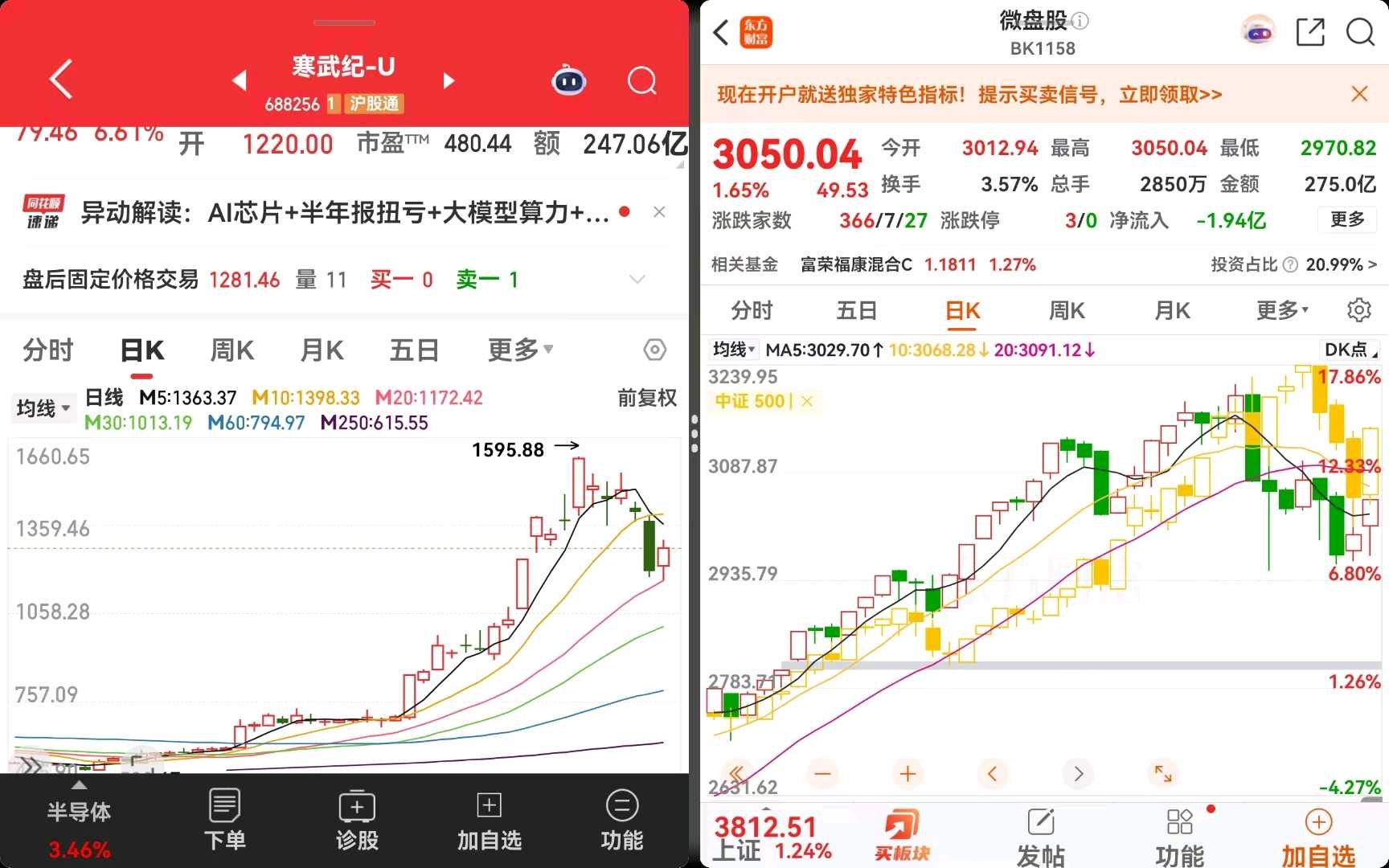 我发现寒武纪就是从那一天开始启动一轮上涨的,还包括易中天等,也就是主线行情。而在历史上,这种情况已经出现过多次了。比如两年前的 ai行情,4年前的新能源行情,在那段时间微盘都是持续低迷的,不过后来的事情大家也都知道了。这一次不过是历史的重复而已,这一现象我在一年半前就反复提过,因为券商有过研报。