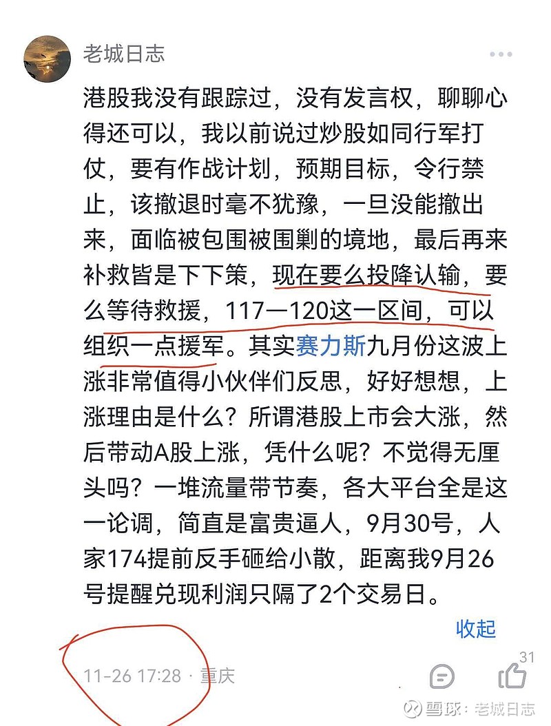 $赛力斯(SH601127)$1简单聊几句赛力斯在117-120区间走了一趟,我11月26日帖子原话是“要么投降认输,要么等待救援,117—120区间可以组织一点援军”上午盘面上,成交量接近八九天来每天全天的量,算是好现象如果117一线堆了量,去111的几率就小,那么在股价大概率就会在我说了整整一年的那个区间波动,即130为中枢,上下10个点,明年会不会延续这个区间,拭目以待