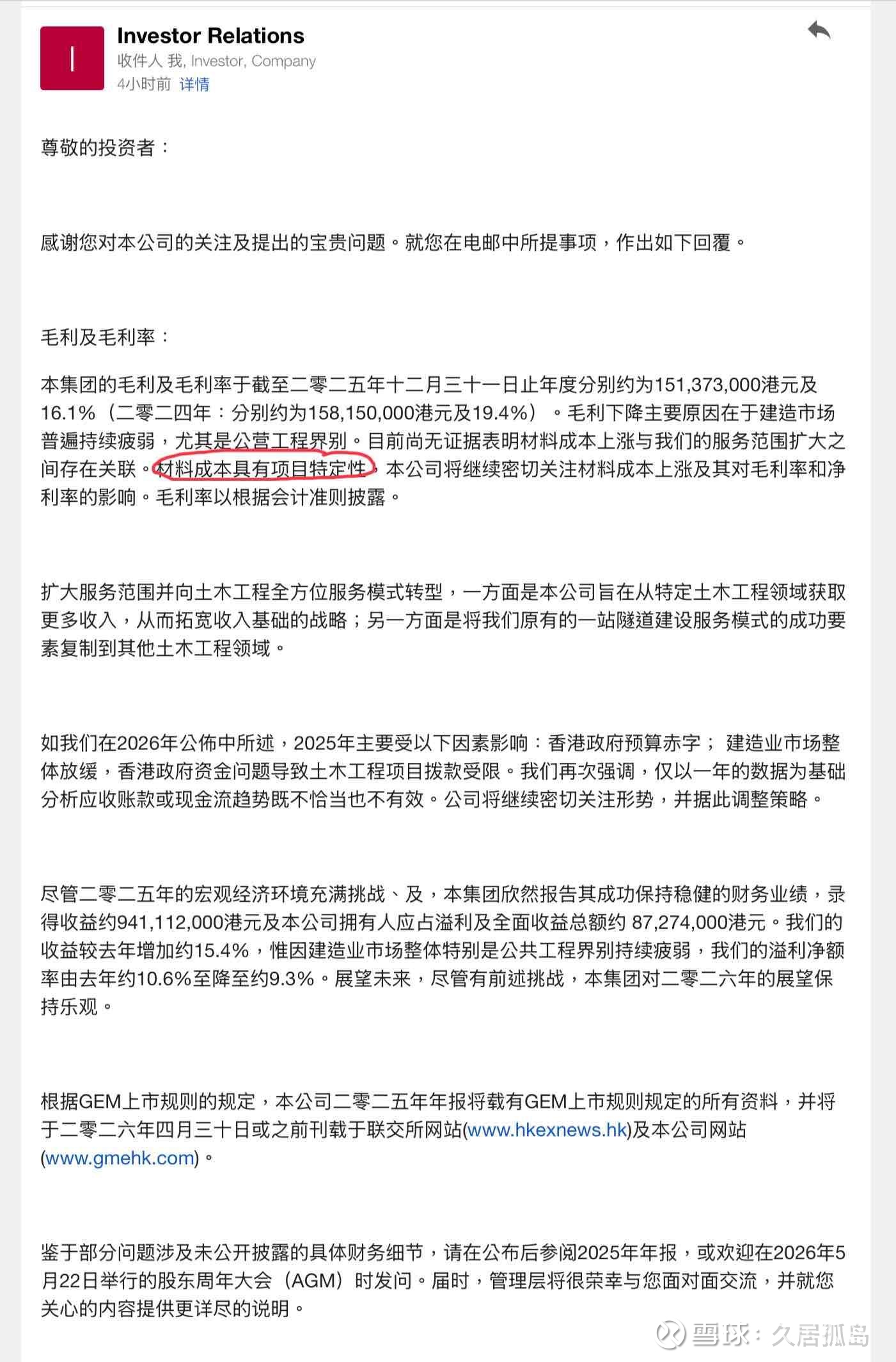 $骏杰集团控股(08188)$ ir回我的邮件写了项目特定性,估计今年材料成本大涨就是因为转型了。不过也有可能前面它还有句话“目前尚无证据表明材料成本上涨与我们的服务范围扩大之间存在关联”项目特定性有可能是代表接了几个成本比较高的项目或者不可控因素,如果今年年报出来发现毛利率回升了,那就说明是这个因素,如果毛利率下降了就说明是转型。或者能拿到两个业务分别的毛利率就可以确定。个人判断还是转型因素概率比较大一些,去年一年公司员工翻倍了还多,并且叠加隧道收入占比减少,材料成本上涨,这三个因素叠加在一起很难说只是巧合。