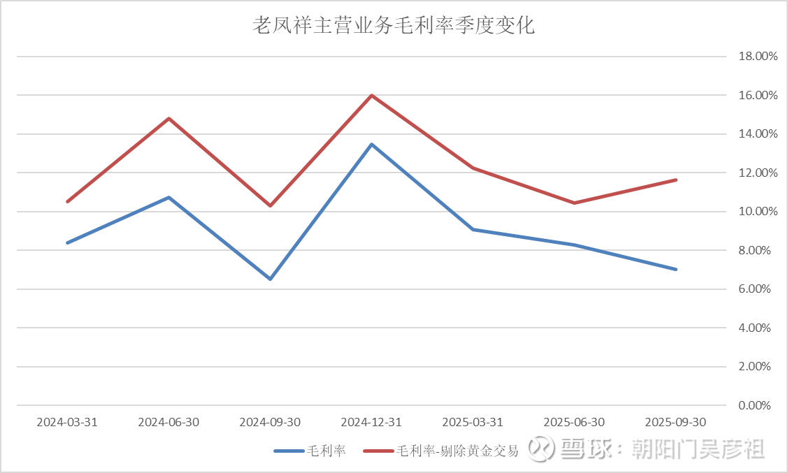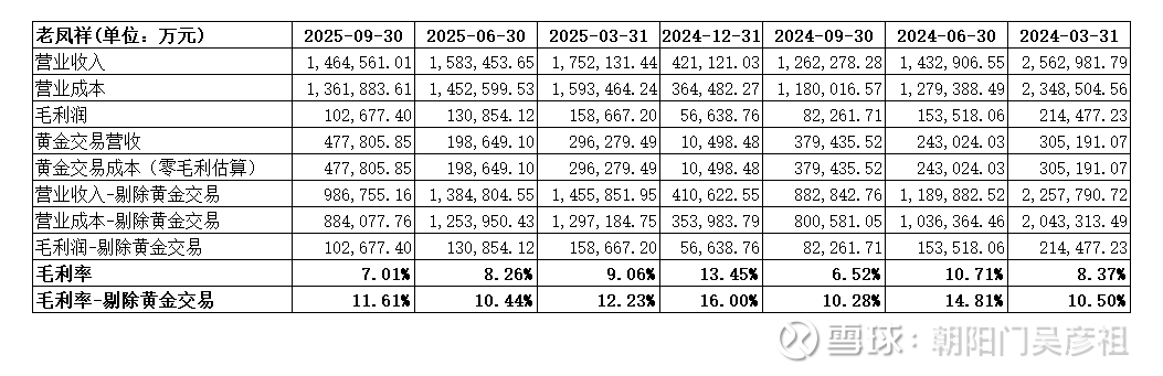 虽然截至三季度整体业务毛利率仍在下滑,但是考虑到黄金交易业务毛利率基本为零,将黄金交易业务从整体营收中剔除后(营业成本按照零毛利估算剔除),可以看到三季度的核心业务毛利率(剔除黄金交易)已经拐头,环比二季度提升了1.18个百分点。