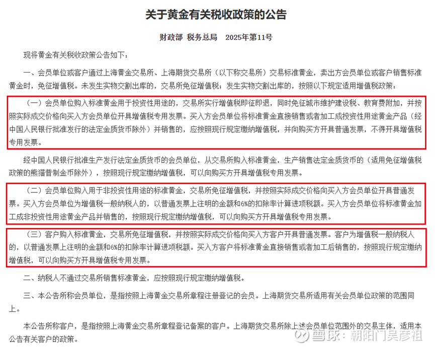 2025年10月29日,财政部联合税务总局发布《财政部 税务总局关于黄金有关税收政策的公告》【财政部 税务总局公告2025年第11号】文件,对于黄金交易的税收政策进行了调整。具体内容见下图: