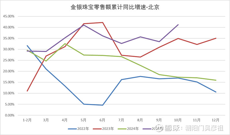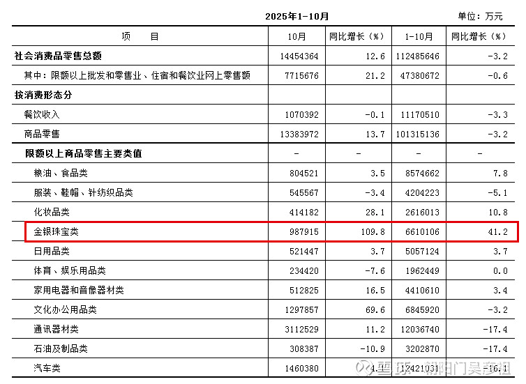 2025年10月份北京市限额以上企业金银珠宝类零售额98.79亿元,同比增长109.8%;1-10月累计零售额661.01亿元,同比增长41.2%。虽然10月中旬菜百总店出现过单日投资金条销售额破亿的情况,但10月份这个数据还是有些夸张。黄金税收新政是10月29日出的,最后3天估计又卖爆了。