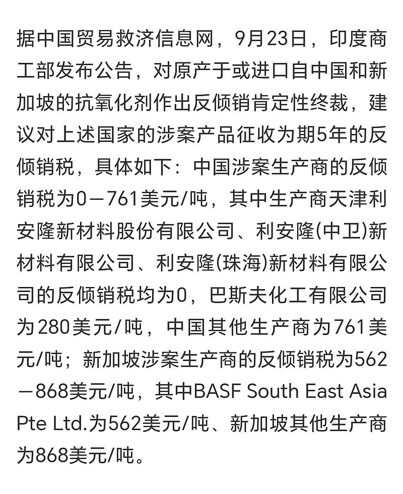 $利安隆(SZ300596)$ 还记得去年利安隆高管说印度那边销售还有东南亚销售情况还不错,其实我反感去印度做生意。。但这次反倾销税居然为0。。。还是别去竞争低价货了,自己有技术就做高端的,低价的不如不做了,纯浪费人力和产能,类似茅台一样只赚高端钱。