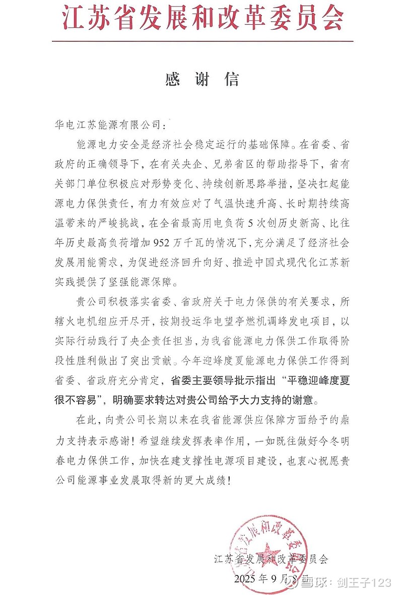 近日华电江苏公司收到江苏省发展和改革委员会感谢信对公司在迎峰度夏能源保供方面作出的突出贡献表示感谢这个夏天持续高温席卷江苏用电负荷屡攀新高公司8月发电量超58亿千瓦时8月6日发电2.2亿千瓦时单月、单日发电量均创历史新高在这场迎峰度夏攻坚战之中华电江苏人以汗水诠释担当用坚守书写责任全力以赴保安全、保发电、保民生华电国际,华能国际,国电电力。大唐发电,国投电力。