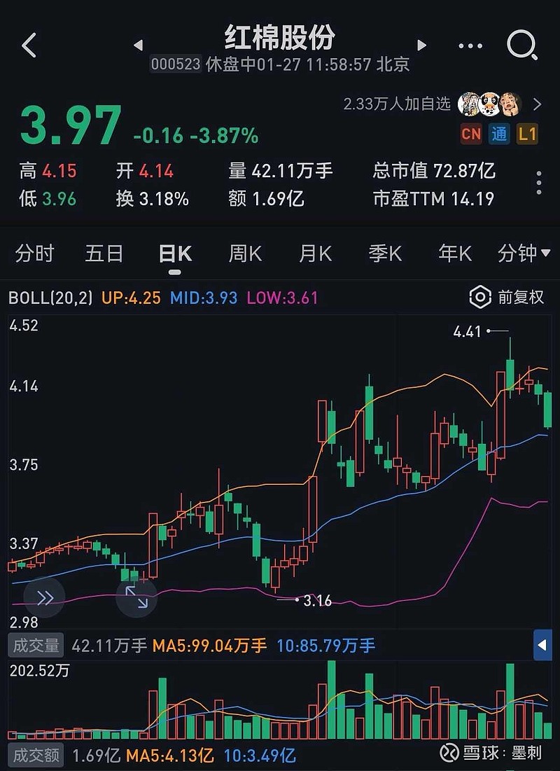 $红棉股份(SZ000523)$2026年游击红棉股份。大涨1-2个交易日卖出,大涨后下跌3-5个交易日再谨慎买入。红棉股份可以反复做。大涨1-2个交易日卖出,无惧卖飞,卖飞不会亏钱。大涨后下跌3-5个交易日买入,买入须谨慎,被套丧失主动权。大盘4100点以上,多谨慎都不为过,甚至是空仓。不做夹头。红棉下午继续大跌考虑买入,暂时没有机会就持币,等。下午出击AI半导体。