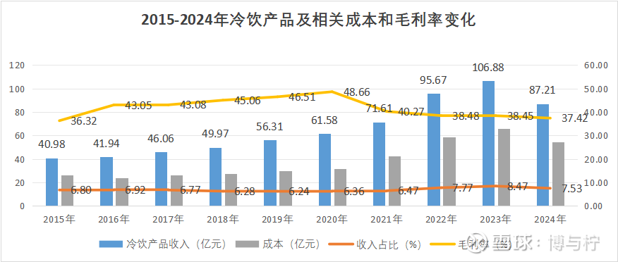 收入从2015年的40.98亿元持续攀升至2023年的106.88亿元,接近翻倍,复合增速约12%。2024年消费疲软,收入回落至87.21亿元,较2023年下降约18.4%。冷饮产品占比相对稳定,但毛利率始终保持较高水平,为利润贡献重要来源。主要凭借“巧乐兹”等经典品牌的持续热销及海外市场拓展,始终保持行业龙头地位,连续30年冷饮行业第一。