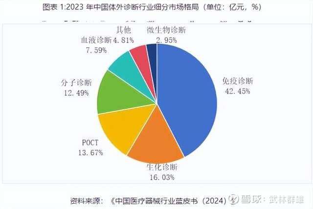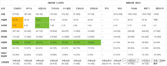 综合以上信息来看,未来的体外诊断公司必然走向平台化和全产业链化,大部分独立的体外诊断公司不再单独存在,在某个高精尖细分领域可能会幸存少量小而美的公司。从当前公司经营情况来看,主营免疫诊断行业营收最大,利润也最大,主营分子诊断行业营收一般,盈利也一般,虽然分子诊断是发展最快的,但是被其它公司抢占不少市场份额。从长期来看,当前体外诊断公司好像并不是一个合适的买点,一是大部分公司现在很有钱,短期很难出清;二是公司当前估值并没有特别低估,增速整体也有所放缓。耐心等待行业持续低迷时再说吧。$迈瑞医疗(SZ300760)$ $艾德生物(SZ300685)$ $迪瑞医疗(SZ300396)$
