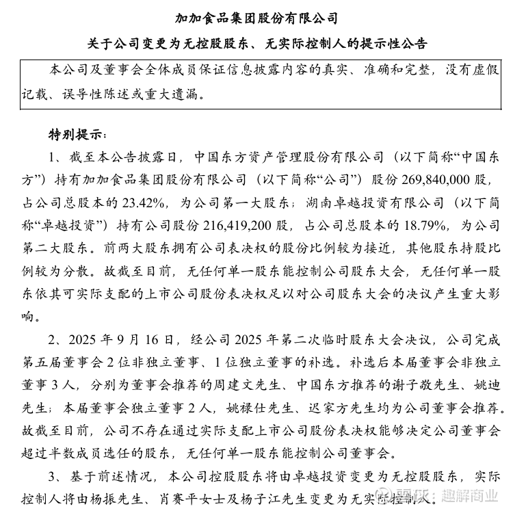 9月16日,加加食品集团股份有限公司(下称“ST加加”)发布“关于公司变更为无控股股东、无实际控制人的提示性公告”。