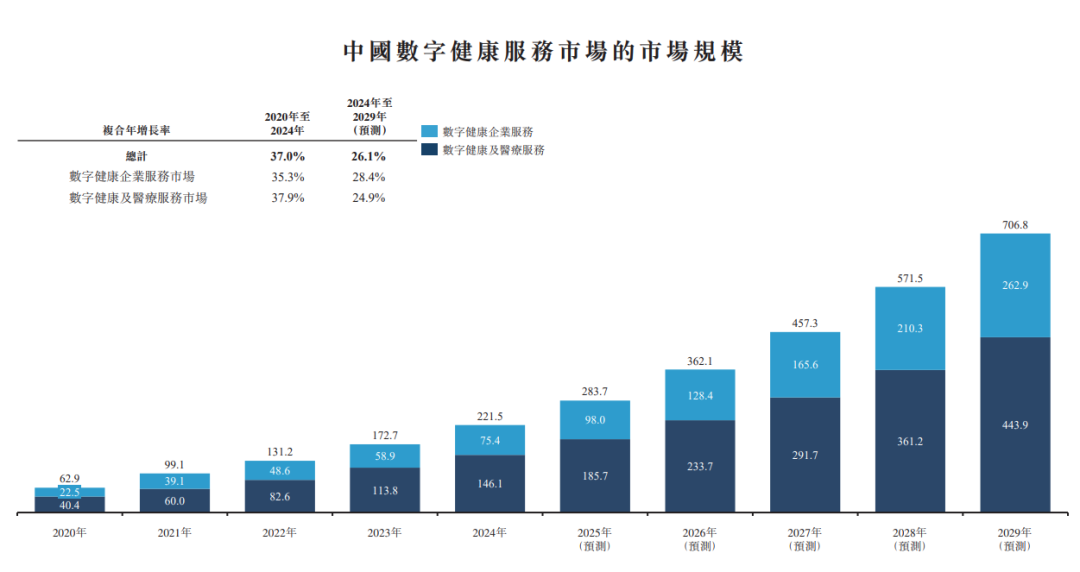 整体数字健康服务市场预期将由2024年的人民币2,215亿元增加至2029年的人民币7,068亿元,复合年增长率为26.1%;