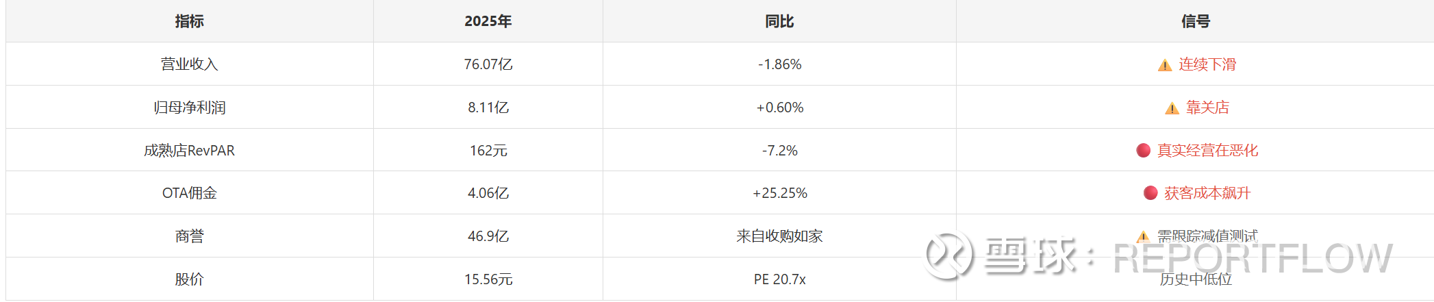 最坏的情况是什么?商誉46.9亿来自收购如家,每年做减值测试(2025年已计提9400万减值),有不确定性但不是"一定会爆"。更值得关注的是OTA佣金继续涨,吃掉加盟收入的增长。轻管理酒店(RevPAR仅82元)把如家品牌口碑拖下水。