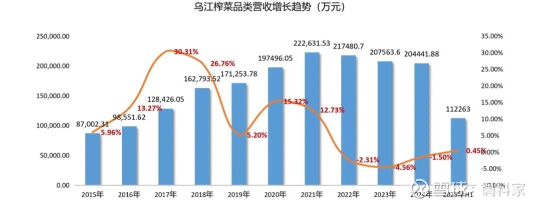 涪陵榨菜其核心品类乌江榨菜,2021年之前是其高光时刻,量价齐升。该年榨菜营收达到顶峰,为22.26亿元,其后就开始出现轻微下跌,2024年为20.44亿元,今年上半年则是微增0.45%。