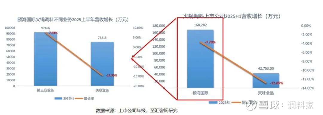 颐海国际的下滑,主要在关联业务,就是海底捞买的少了,同比下滑了14.56%;但第三方业务增长稳定,同比增长了7.49%。