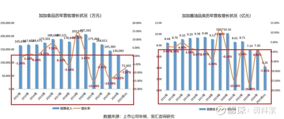 最后一家酱油领域的上市公司加加食品,其酱油营在2020年达到高峰,为10.17亿元;此后起起伏伏,到2024年下降到7.30亿元;今年上半年下降了7.41%。