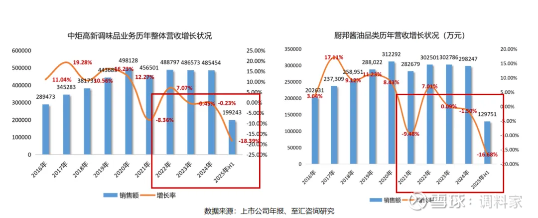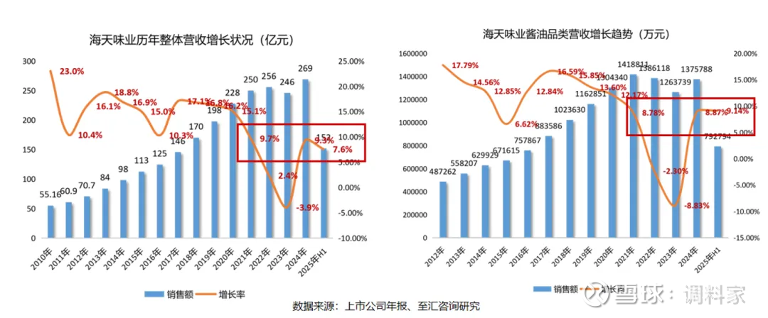 从2020年到2025年,海天味业仅在2023年因前一年“双标”事件影响,酱油业务出现了下降,为-3.91%。其余年份,酱油业务仅实现正增长,且2024年和今年上半年增幅分别为9.35%和7.59%,都不低。