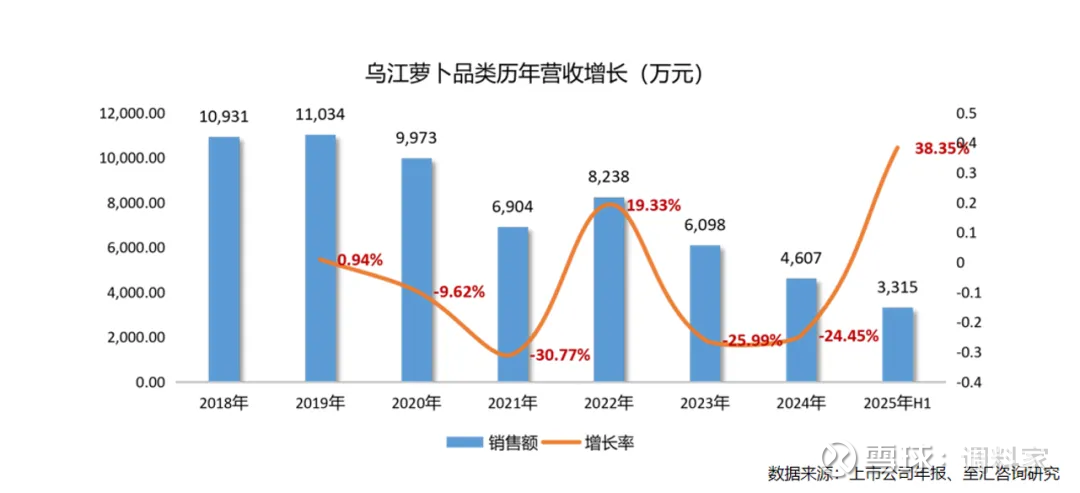 该公司的萝卜干曾经有过亮眼的表现。2018年时,萝卜干的营收曾将达到了1.09亿,2019年达到1.1亿。但此后就开始下降,2021年更是下降了30.77%,仅有6904万元。2024年只剩4607万元,但在今年上半年增长了38.35%。