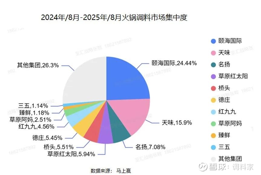 线下零售市场份额方面,同样是来自马上赢的数据:目前颐海国际排第一,占比为24.44%;天味第二,占比15.9%;名扬第三,占比7.08%;桥头第四,占比5.94%。其后是草原红太阳、桥头、德庄、红99等。