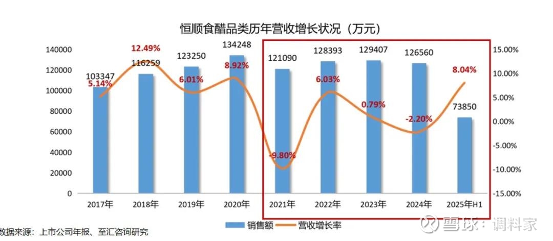 恒顺醋业的食醋营收在2020年达到高峰,13.42亿元。此后有起有落,在2024年保持在12.66亿元;今年上半年,其食醋的营收同比上涨了8.04。