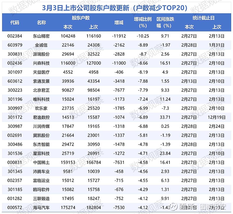 3月3日股东户数减少榜出炉,筹码越收越紧👇1️⃣ 东山精密(002384)股东数减10.25%,区间涨9.71%筹码集中+股价涨,资金在悄悄吸筹?2️⃣ 金诚信(603979)股东数减8.89%,区间微跌-1.97%筹码缩量调整,后续能跟吗?3️⃣ 派瑞股份(300831)股东数减8.7%,区间涨2.56%小跌后筹码集中,趋势要起?股东数减少=筹码集中,这几只你在持仓里吗?
