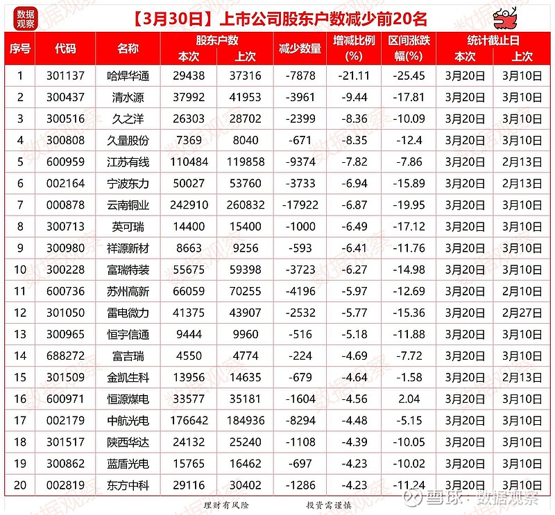 🔥3月30日股东户数更新-减少 TOP20📊股东户数减少前五名明细如下:1. 哈焊华通股东户数减少比例:-21.11%区间涨跌幅:-25.45%2. 清水源股东户数减少比例:-9.44%区间涨跌幅:-17.81%3. 久之洋股东户数减少比例:-8.36%区间涨跌幅:-10.09%4. 久量股份股东户数减少比例:-8.35%区间涨跌幅:-12.4%5. 江苏有线股东户数减少比例:-7.82%区间涨跌幅:-7.86%