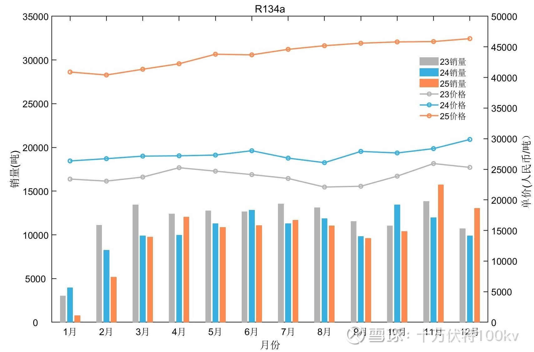 12月R134a均价46343,环比+475。2025年销量对比2024年-2.7%。