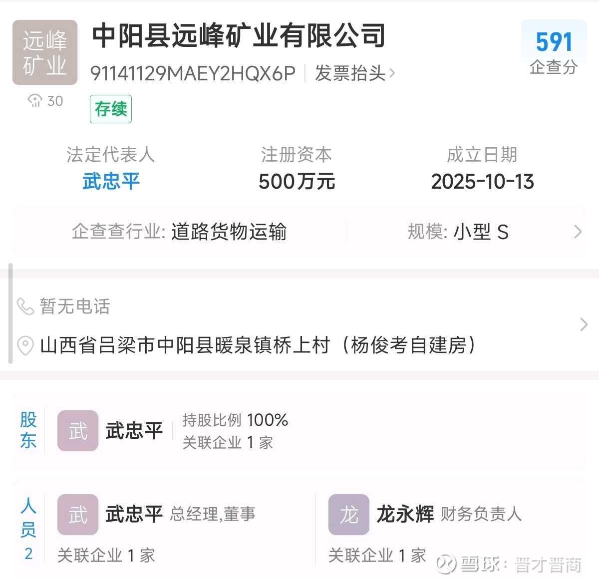 对比之下,成功竞得另一宗矿权的中阳县远峰矿业有限公司则显得“神秘”许多。企查查信息显示,这家公司成立于2025年10月13日,距今仅约一个月时间。