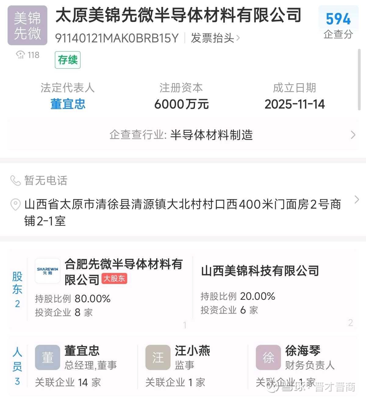 从股权结构看,该公司由合肥先微半导体材料有限公司与美锦能源全资子公司山西美锦科技有限公司共同持股。这种合作模式结合