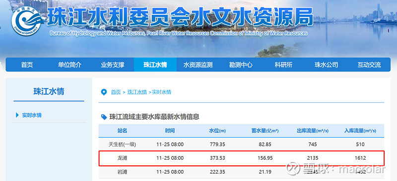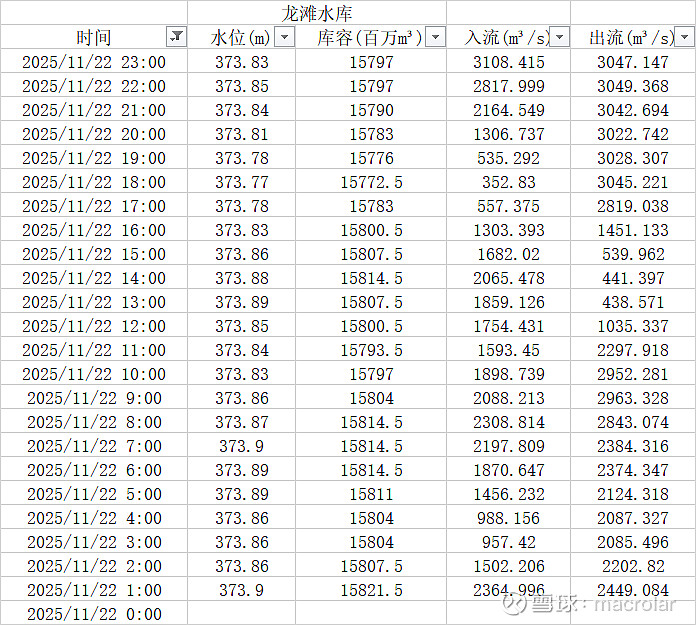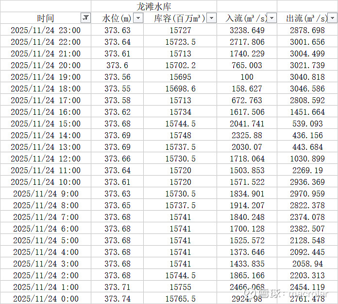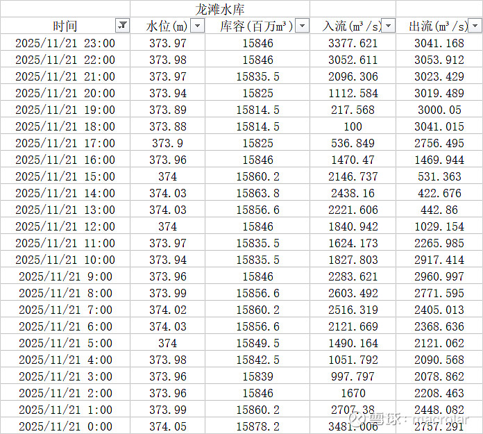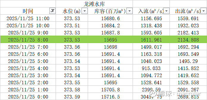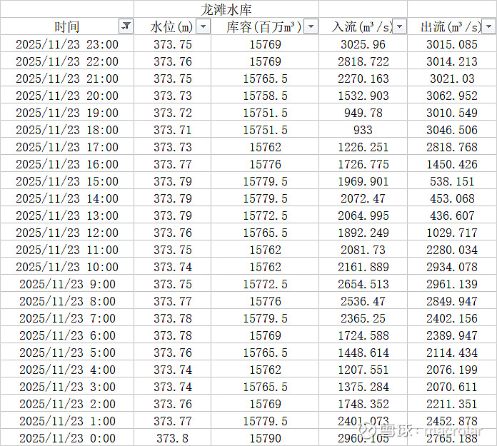 $桂冠电力(SH600236)$ 11月25日桂冠龙滩水库每小时出入库流量数据更新,龙滩水位373.53米10月最高蓄满375米。目前上游天生一779.34米,董菁488.8米,光照735.3米,马马崖582.4米。掌握每小时数据的变化能正确判断发电势头,数据准确性请对比水利部珠江委网站发布的早8时数据。会不会补下面K线缺口,走一步看一步留点子弹吧