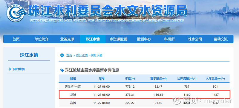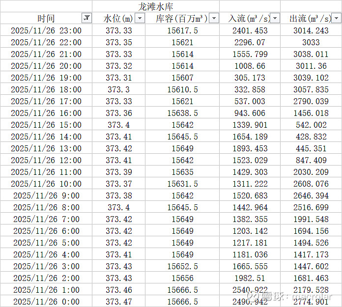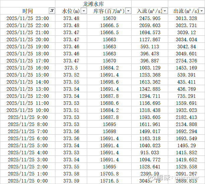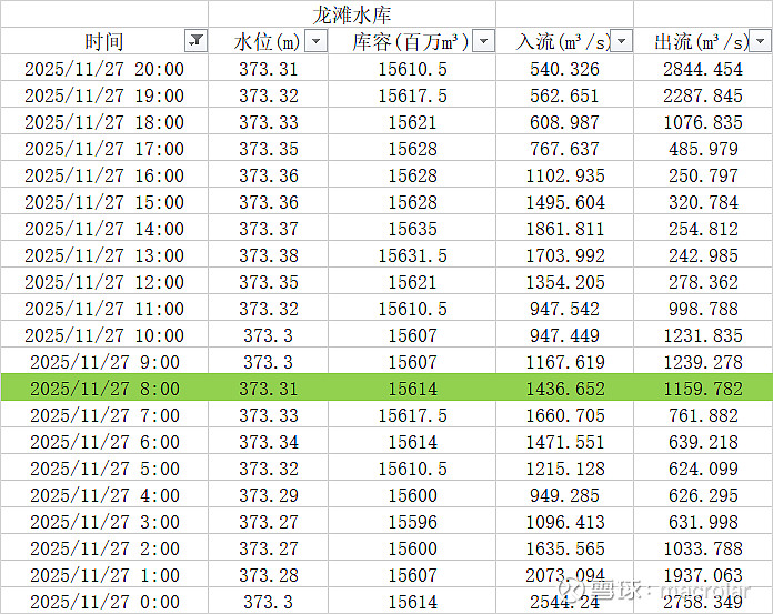 $桂冠电力(SH600236)$ 11月27日桂冠龙滩水库每小时出入库流量数据更新,龙滩水位373.31米10月最高蓄满375米。目前上游天生一779.07米,董菁488.6米,光照735.7米,马马崖583.3米。掌握每小时数据的变化能正确判断发电趋势,数据准确性请对比水利部珠江委网站发布的早8时数据。11月27日来水流量和出水流量比平时少,继续观察。60天均线暂时受到支撑,还会不会补下面K线缺口走一步看一步偶还是留了点子弹。