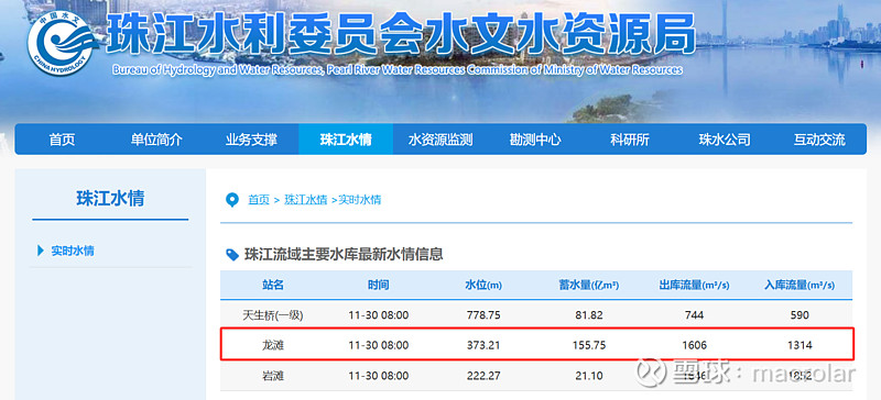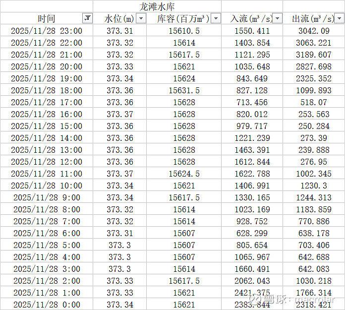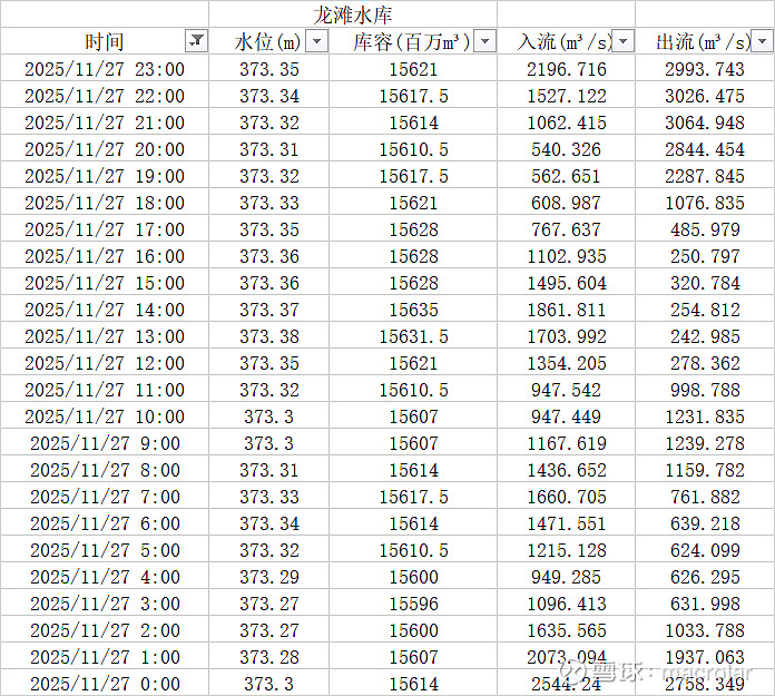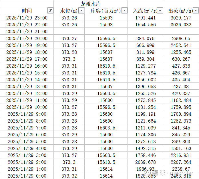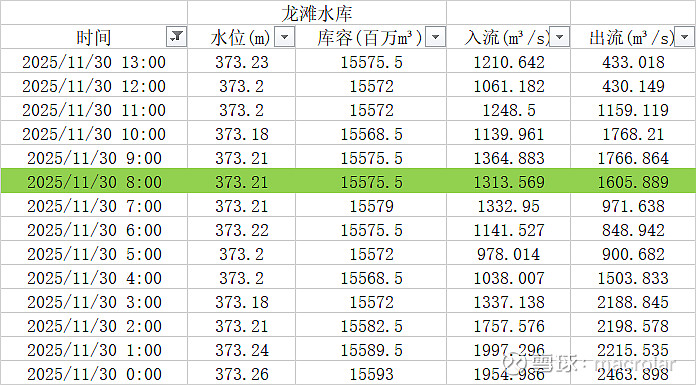 $桂冠电力(SH600236)$ 11月30日桂冠龙滩水库每小时出入库流量数据更新,龙滩水位373.2米10月最高蓄满375米。目前上游天生一778.72米,董菁488.3米,光照736.3米,马马崖582.5米。掌握每小时数据的变化能正确判断发电趋势,数据准确性请对比水利部珠江委网站发布的早8时数据。