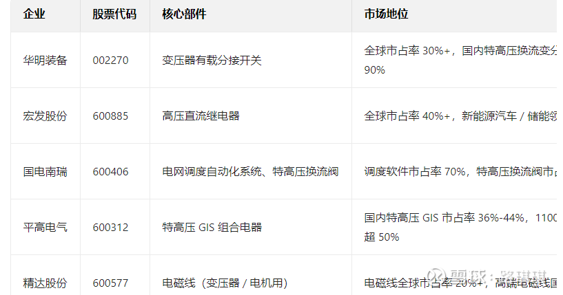除华明装备外,电力设备领域拥有核心部件加工垄断 / 绝对领先地位的上市企业,重点推荐 3 家最具代表性标的,适配电网建设与新能源转型需求。