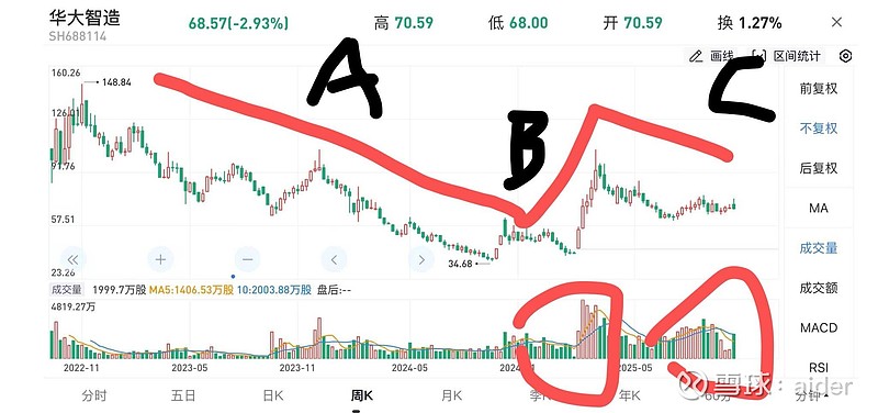 $华大智造(SH688114)$ 好票。大结构是下跌~反弹~再杀跌的A B C结构;A杀到低位,主力资金进场捡筹码,大资金进场买票,股价上涨,形成反弹;说明主力对那个低位区域的认可,后期回调很难跌破;如果没有主力进场,那股价还有的跌;目前处在C浪杀跌的末端,什么时候结束洗盘,等盘面信号即可;雪球的划线功能不能用了,凑合看咯。