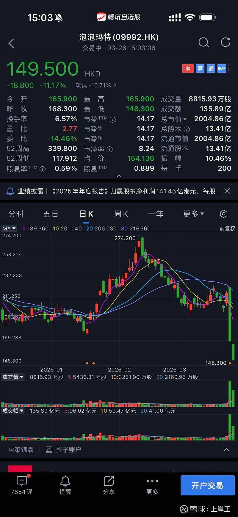 $泡泡玛特(09992)$ 跌成这样,太可怕了!鉴于局势很迷离,我今天被动减仓了,今年的盈利已经回撤 了 75%,无法再无视了,明天把剩下的利润成果全部取出来,打算 4 月份从头开始,不要老觉得有利润影响了决策和行动力。$明阳智能(SH601615)$ $特锐德(SZ300001)$