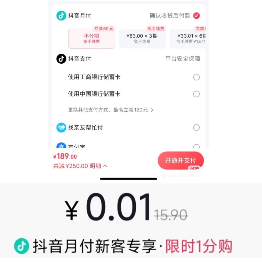 而“抖音月付”,排在抖音支付选项的第一位,用加粗标红、满减后低至1分钱的力度、默认勾选的小心机,占据了绝对的本场“支付地位”。