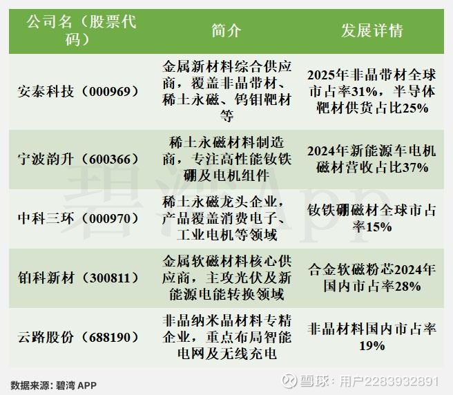 安泰科技在非晶带材领域全球市占率达31%,位居全球第二,稀土永磁材料在国内伺服电机领域市占率超12%,其钨钼靶材在国内半导体设备厂商供货占比达25%,核心产品技术壁垒构筑行业领先地位。