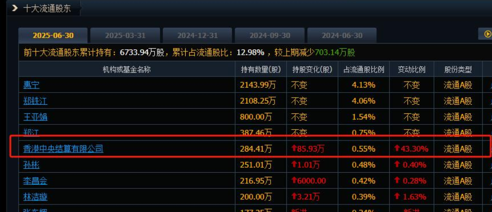从公司的前十大流通股东看,香港中央结算(北向资金)二季度减仓1084.21万股,目前仍持股1.38亿元股,位列公司第六大股东。