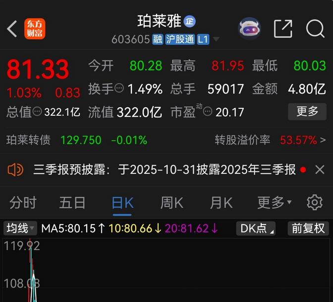 去年大盘2700点时,珀莱雅股价是91.50元,截至周五收盘,股价只有81.33元,低于去年2700点的位置。