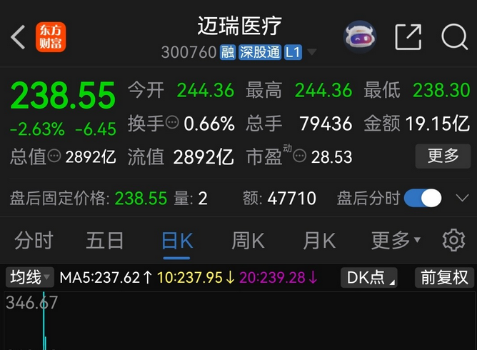 去年大盘2700点时,迈瑞医疗股价是260元,截至周五收盘,股价只有238.55元,低于去年2700点的位置。