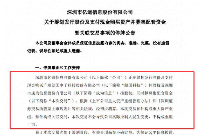 上市公司亿道信息发布公告称,公司正在筹划发行股份及支付现金购买广州朗国电子科技股份有限公司控股权,以及深圳市成为信息股份有限公司控股权,同时拟募集配套资金,预计构成重大资产重组。公司股票自明天起停牌,预计停牌时间不超过10个交易日。