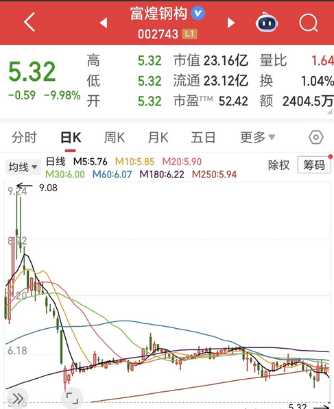 周一开盘,该来的还是如期而至,一个迎头暴击从天而降,富煌钢构的股价直接开于一字跌停价5.32元,场内股民就这样被一锅焖在了里面。
