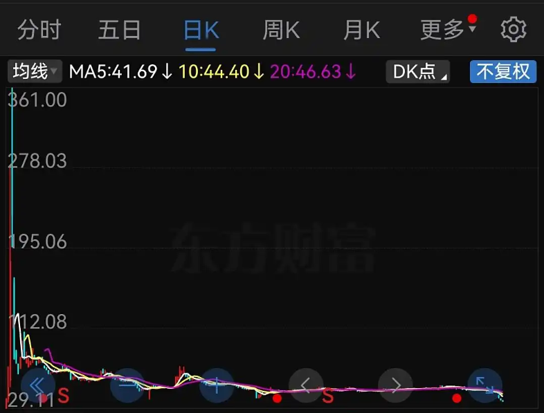 真是不看不知道,一看吓一跳!股市竟然有跌得如此之狠的股票。上市才一年时间,股价从最高361元跌到了36.65元,腰斩了三次还多,暴跌了90%。