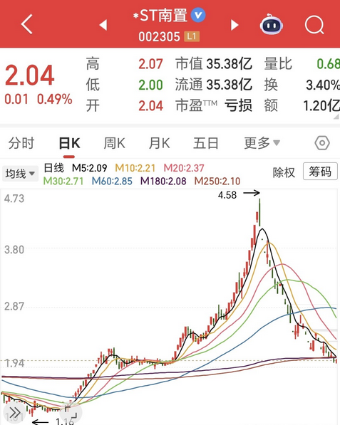 不过光看近期跌幅可能有失偏颇,得先看他前期涨了多少,*ST南置年内的最低价为1.16元,出现在4月9日,此后的股价尤如乘上了蹿天火箭,一路呼呼的往上涨,涨至8月19日的最高4.58元,4个多月时间股价的最大区间涨幅达295%,接近3倍的涨幅已经甩了许多非ST好几条大街了。