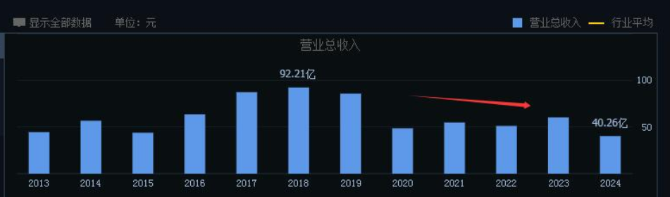 公司的营收自从在2018年见到了92.21亿元之后,就开始缓慢下滑了。到了2024年,其营收仅实现了40.26亿,相比于高峰时期,跌到了一半还要多。