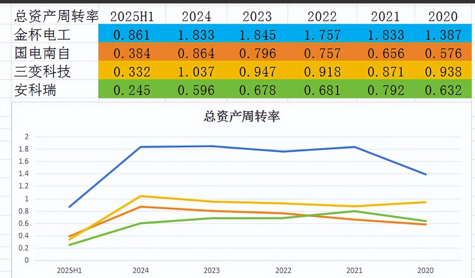上半年,资产周转速度最快的是金杯电工的0.861次,其次是国电南自,三变科技,安科瑞。