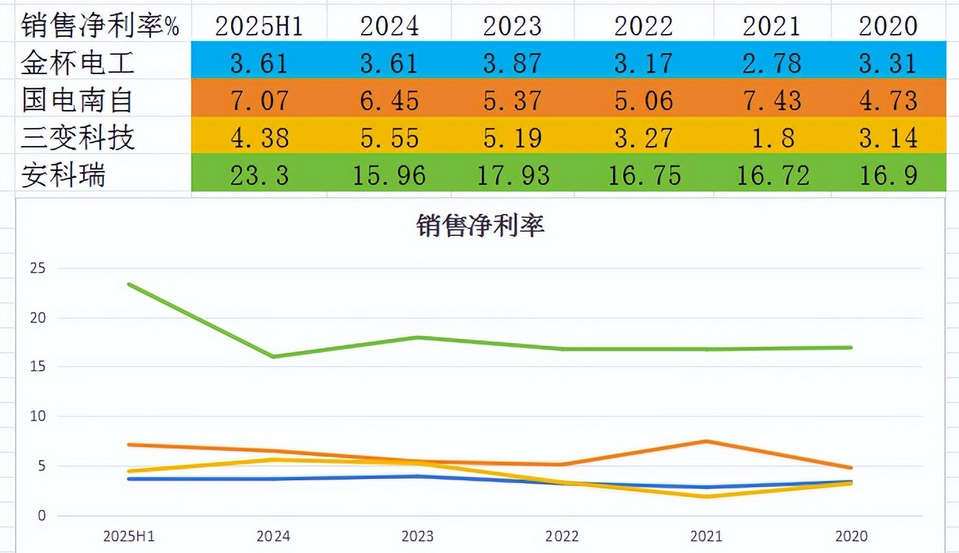 上半年,盈利能力最强的也是安科瑞的23.3%,意味着公司每获得100元收入,就能净赚23元之多;其次是国电南自,三变科技,金杯电工。